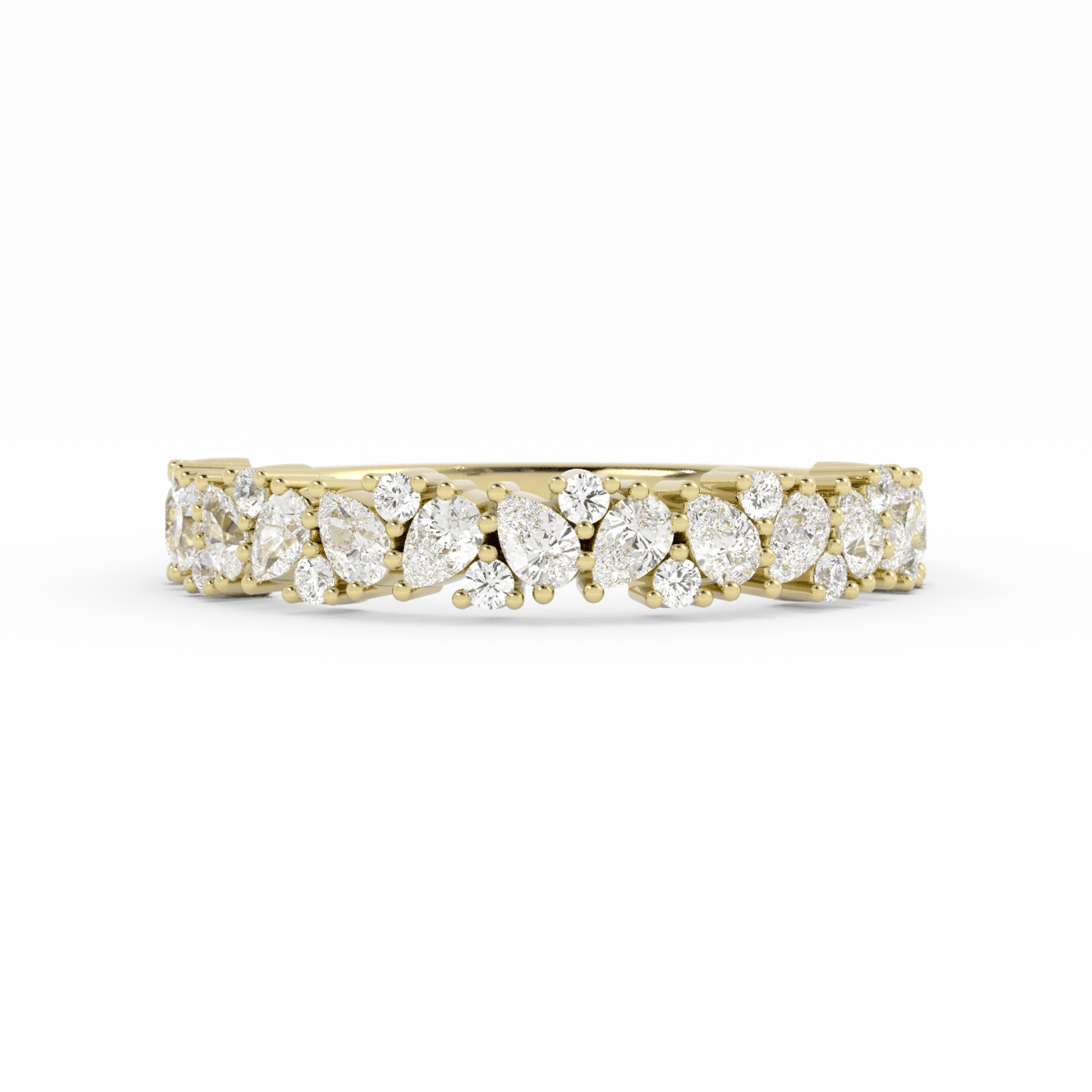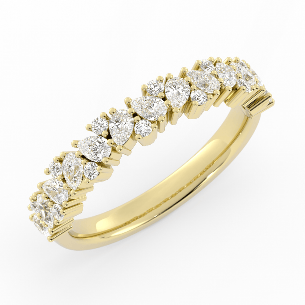 Whimsical yet refined, this delicate cluster ring features pear-cut stones set at a gentle tilt, each one alternating in direction to create a flowing, petal-like silhouette. Between them, round stones are carefully placed to bring sparkle and softness, creating a design that feels both romantic and sculptural. A modern heirloom in the making.