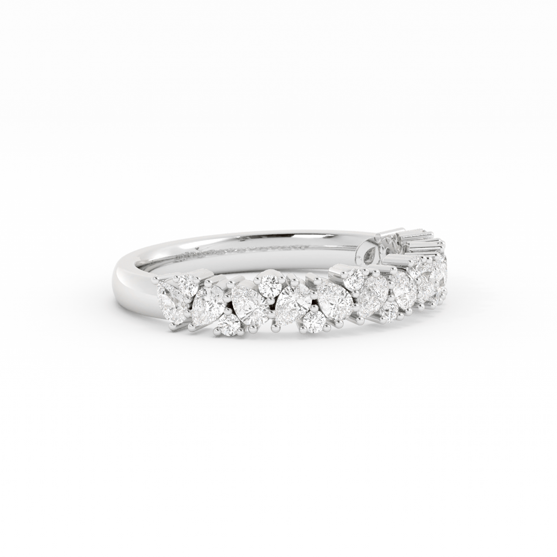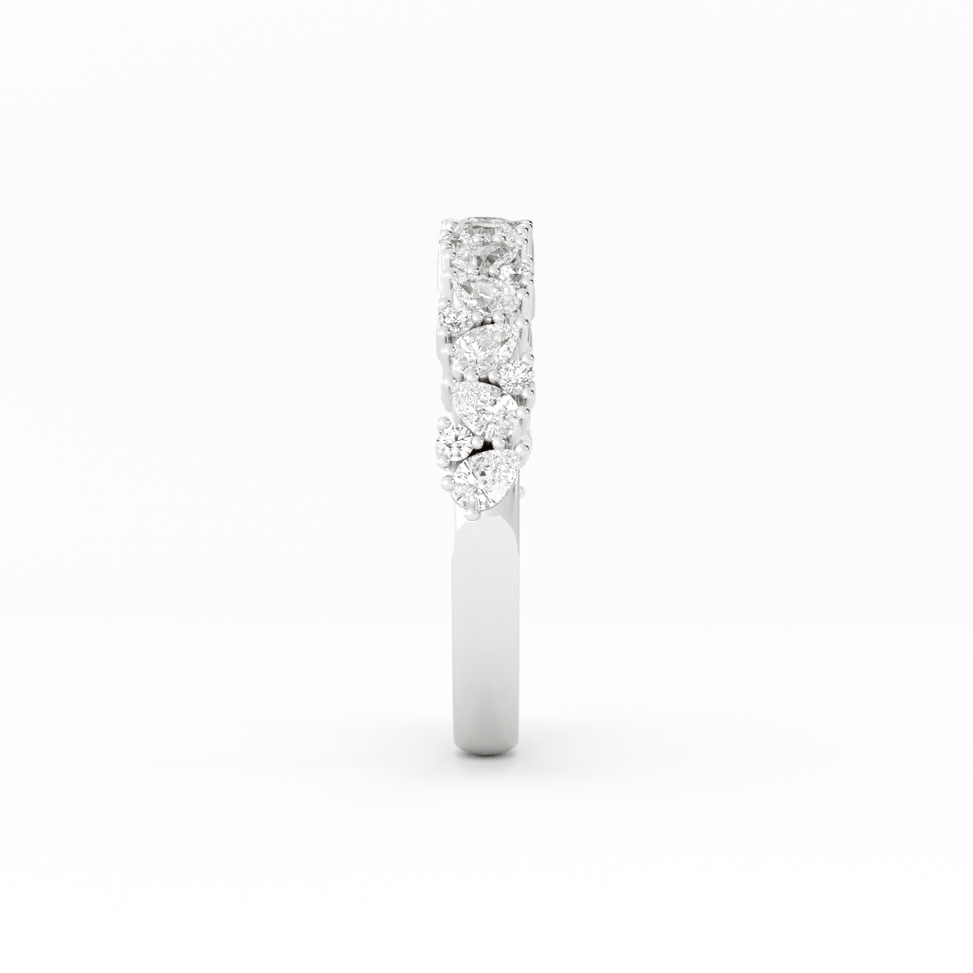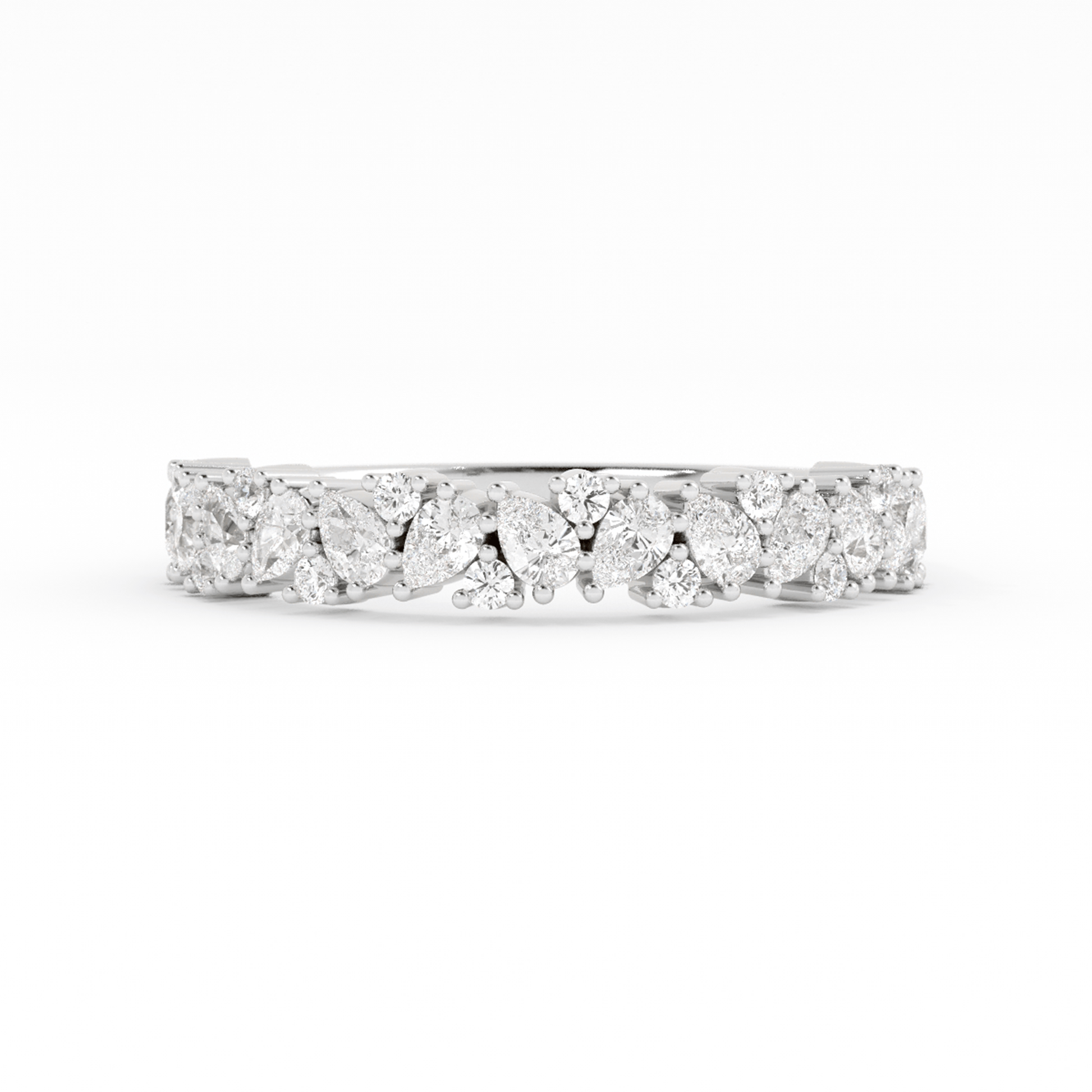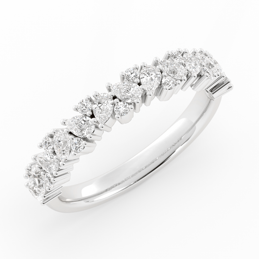 Whimsical yet refined, this delicate cluster ring features pear-cut stones set at a gentle tilt, each one alternating in direction to create a flowing, petal-like silhouette. Between them, round stones are carefully placed to bring sparkle and softness, creating a design that feels both romantic and sculptural. A modern heirloom in the making.