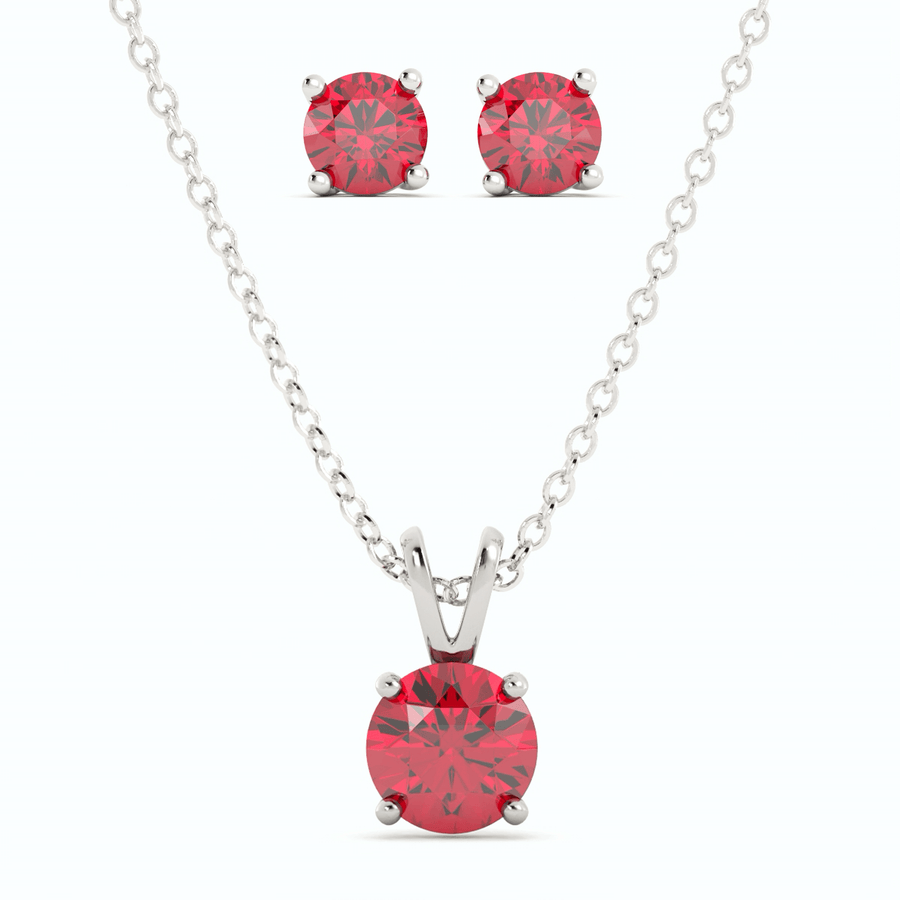 Complementing the pendant, the stunning earrings are the epitome of decadence, perfect for adding a touch of brilliance to your everyday look. Each earring features an exquisite lab-grown ruby, radiating a vibrant splash of color. The 18 karat white gold plating amplifies their radiant sparkle while adding to their enduring elegance.
