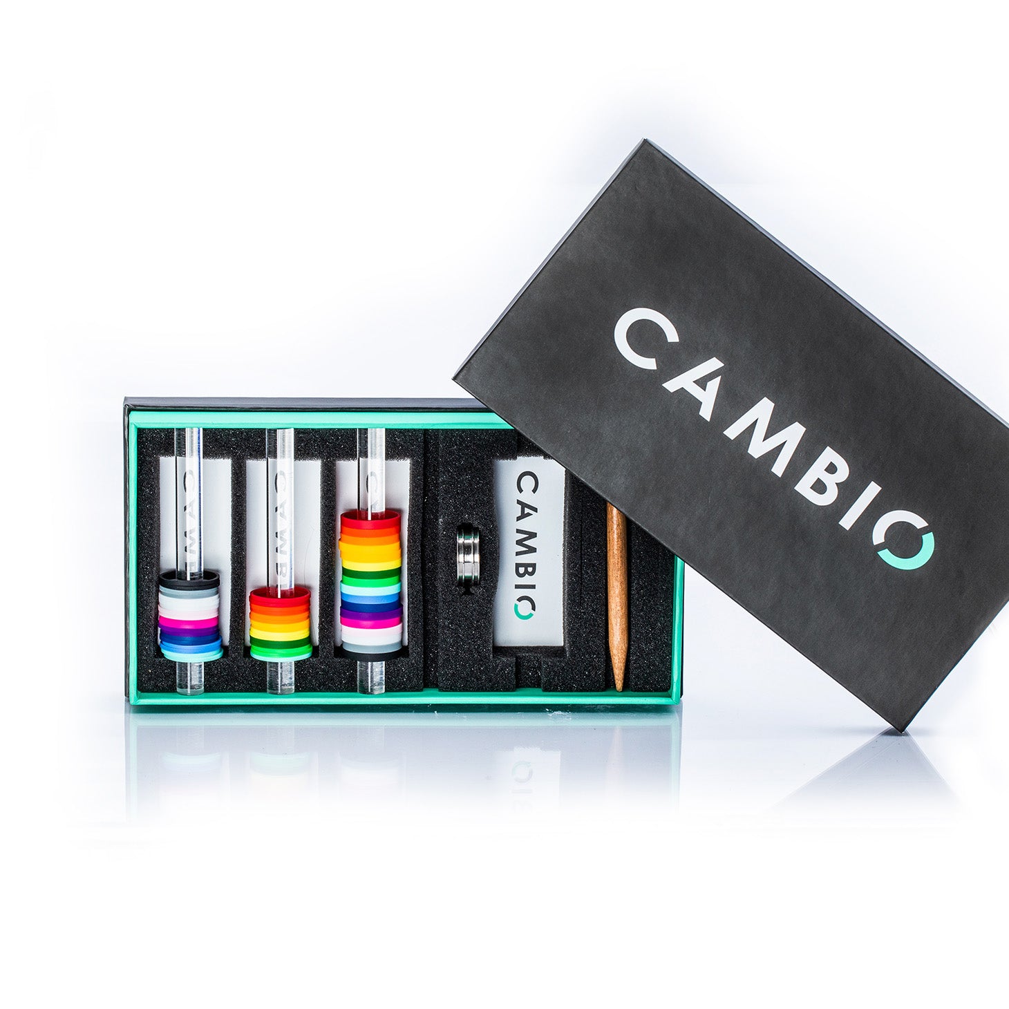 The CAMBIO box comes in 16 colors: white, grey, black, purple, navy blue, blue, teal, forest green, green, yellow, tangerine, orange, red, dark red, hot pink, and pink. It also comes with a wooden rod that can easily remove the bands on your ring.
