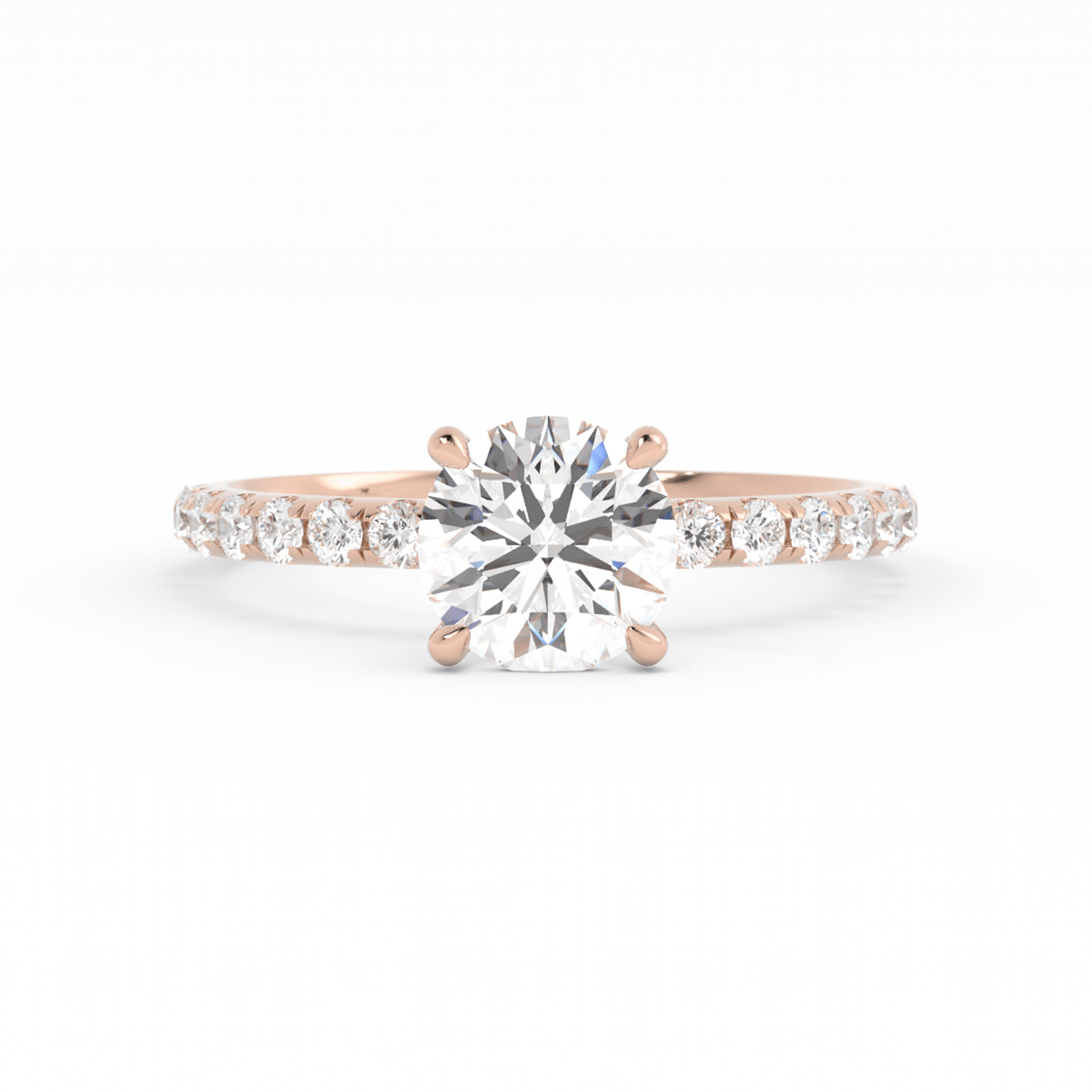 Elegant and refined, this engagement ring features a round center stone set with four claw prongs, complemented by a dainty band adorned with pavé-set stones halfway down the shank—offering delicate sparkle in a timeless, stackable design.