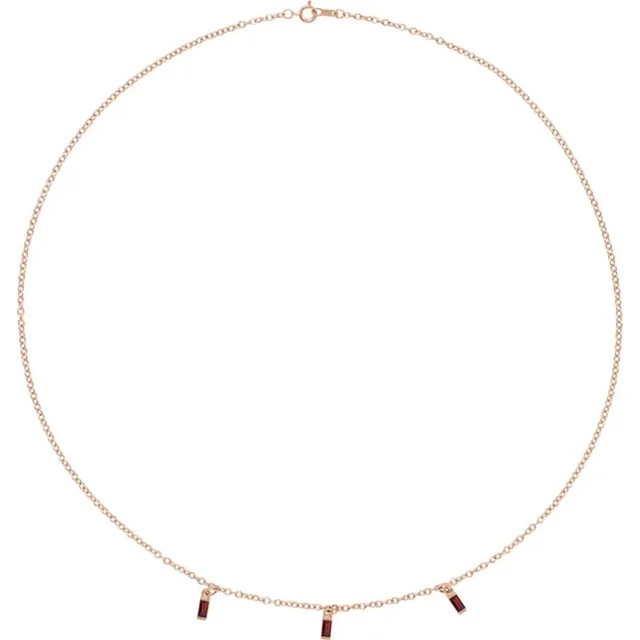 "A timeless piece of understated sophistication, this 16-inch cable chain necklace features three exquisite 4x2mm bar-set Mozambique baguette garnets, each carefully selected for their rich, radiant color. The vibrant, deep red of these AA-quality garnets is artfully spaced evenly around the front of the necklace, creating a striking focal point that catches the light from every angle. The stones are securely set in sleek, modern bars that highlight their angular beauty, offering a contemporary twist on a classic design. Secured with a reliable spring ring clasp, this necklace sits gracefully on the neckline, making it a perfect addition to both everyday elegance and special occasions. Whether worn alone for a minimalist look or layered with other pieces, it promises to be a versatile and cherished accessory for years to come."