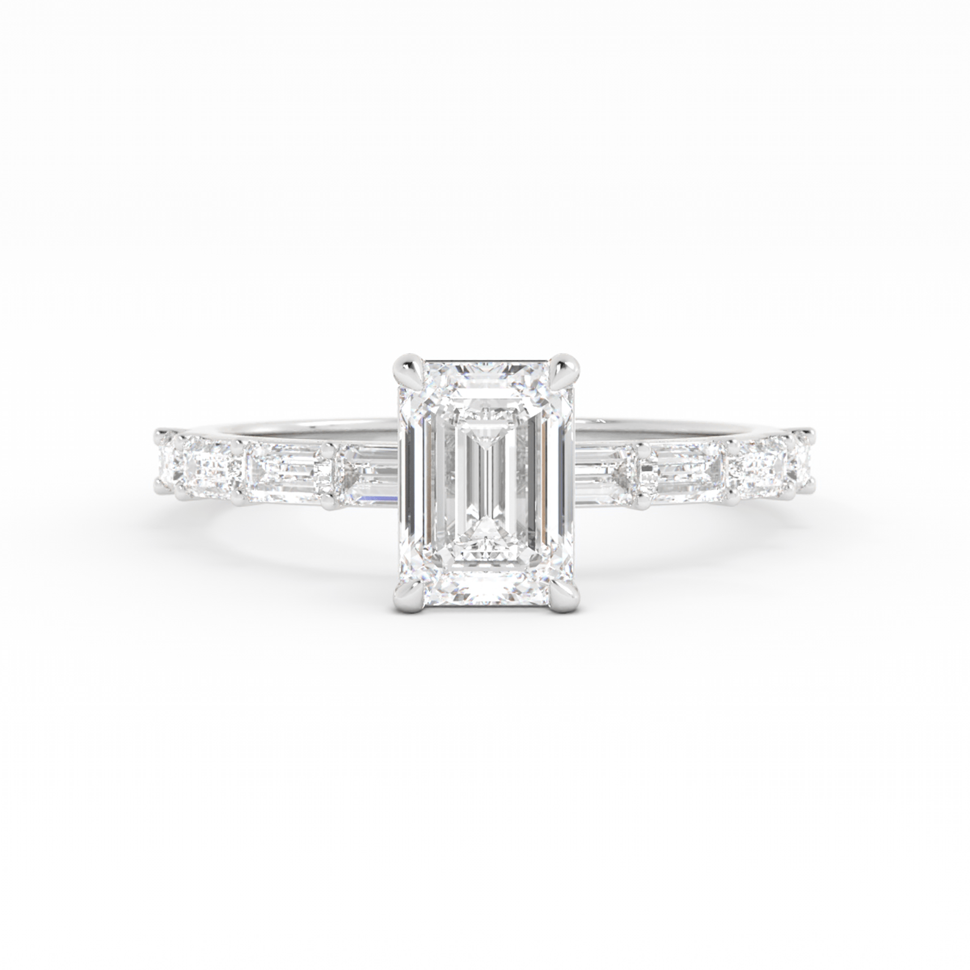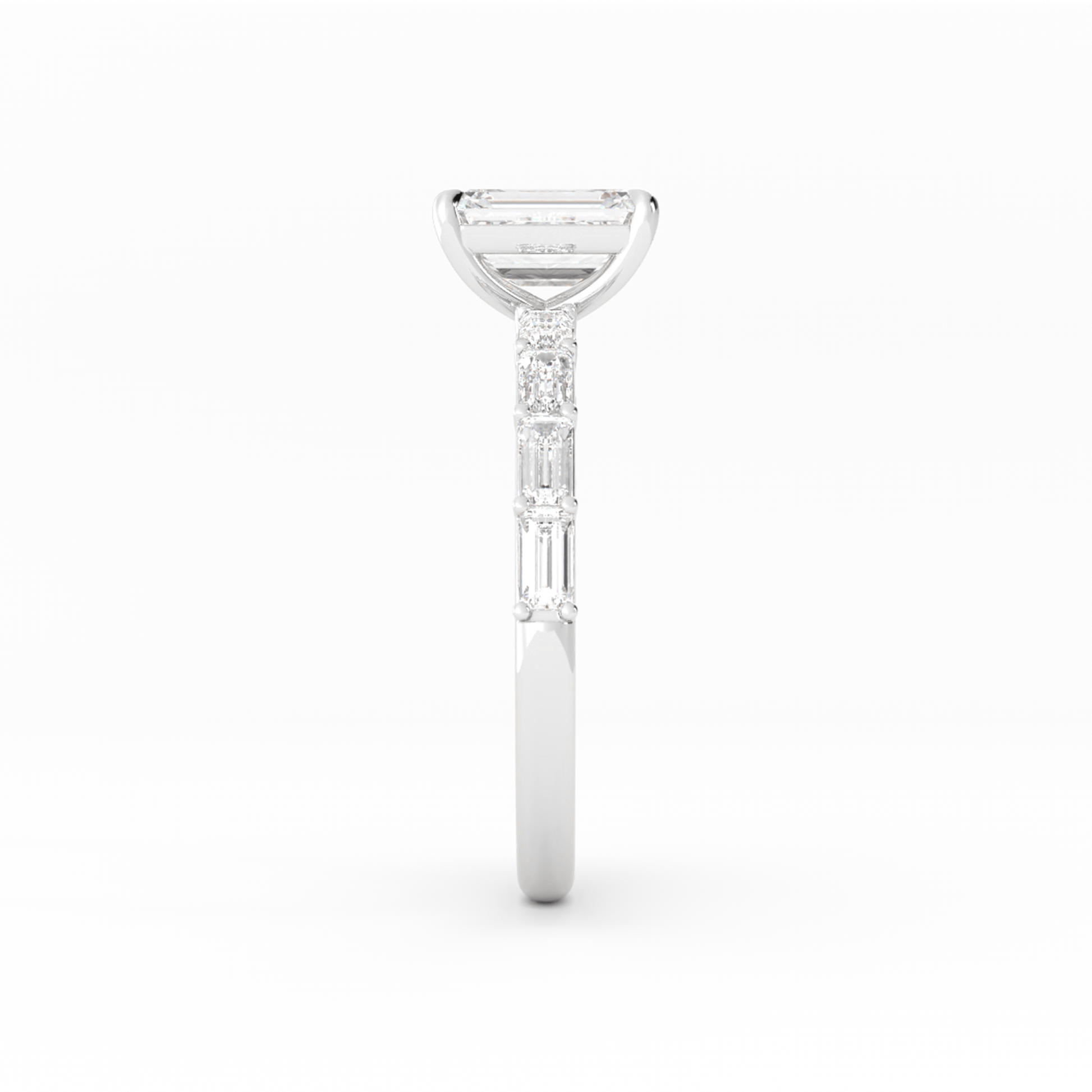 Sleek and sophisticated, this engagement ring features an emerald-cut center stone set with four claw prongs, showcasing its clean lines and timeless elegance. Straight baguette accent stones extend halfway down the shank, adding refined sparkle and a structured, modern feel—finished with a slim, stackable band for effortless pairing.