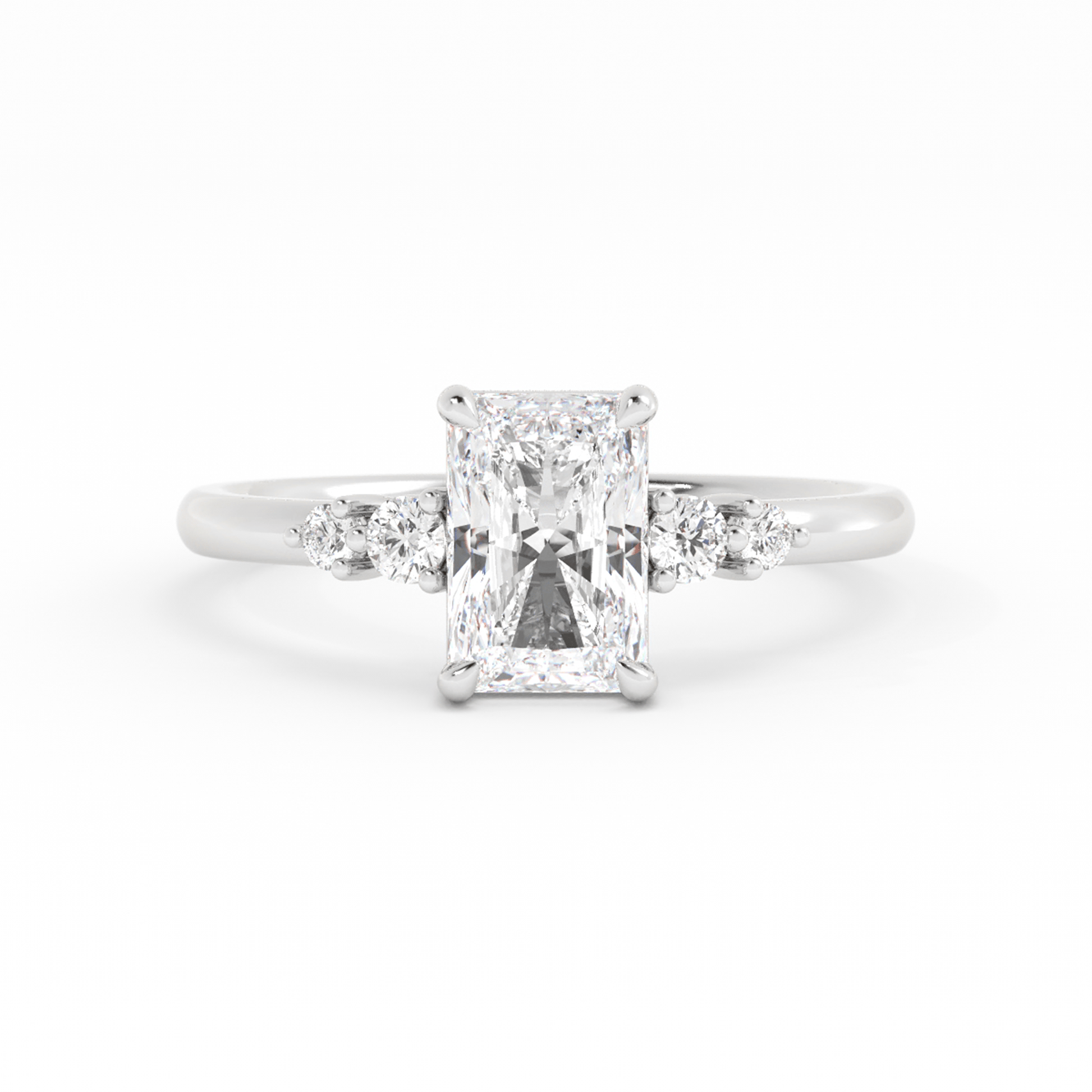 Delicate and radiant, this engagement ring features a brilliant radiant-cut center stone set with four claw prongs, elegantly framed in a classic basket setting. On each side, two small graduating round stones add a soft touch of sparkle and balance, all set along a dainty shank for a refined, timeless look with graceful detail.