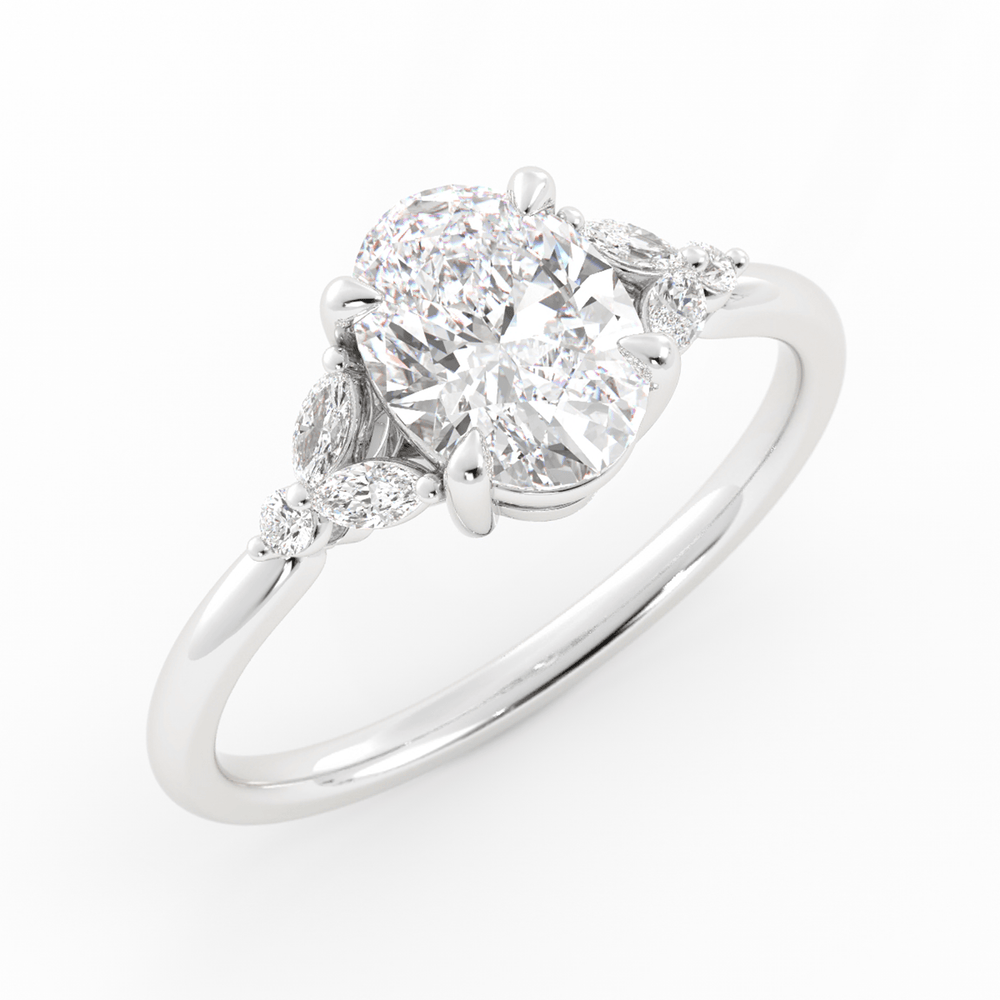 Delicate and distinctive, this engagement ring features an oval center stone set with four claw prongs, nestled in a graceful basket setting. On each side, two marquise accent stones create a soft split-shank effect, meeting at a single round accent stone for a touch of symmetry and sparkle. Finished with a dainty band, this design blends elegance and artistry in a beautifully balanced silhouette.