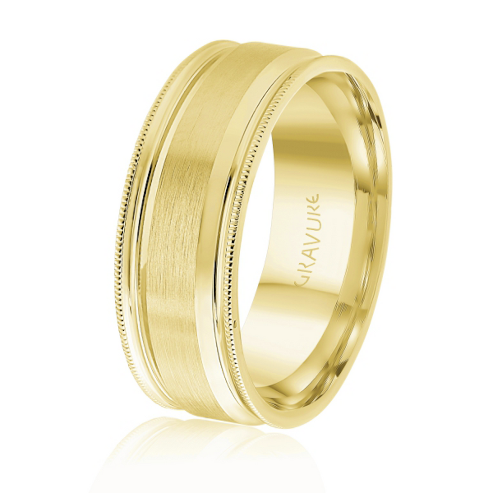 This men’s band features a satin-finish center framed by sharply beveled grooves that add bold depth and definition. Fine rows of milgrain along each edge soften the look with subtle texture. Clean and structured with a touch of classic detail, this ring strikes a balance between modern design and timeless style.