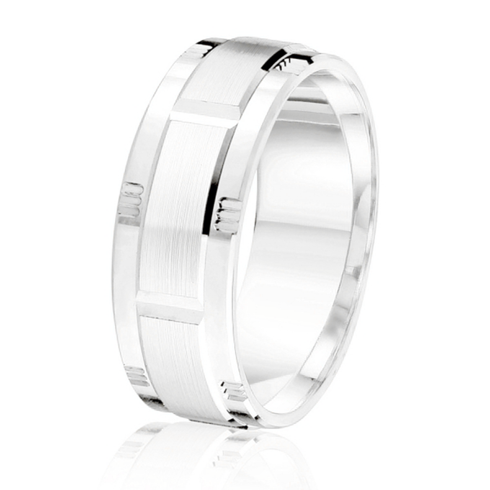This men’s band features a raised satin-finish center with vertical grooves that create a structured, grid-like texture. The polished edges are accented with subtle notched detailing placed intermittently around the band, adding a unique tactile element. With its bold lines and understated finish, this ring brings an industrial edge to a classic silhouette.