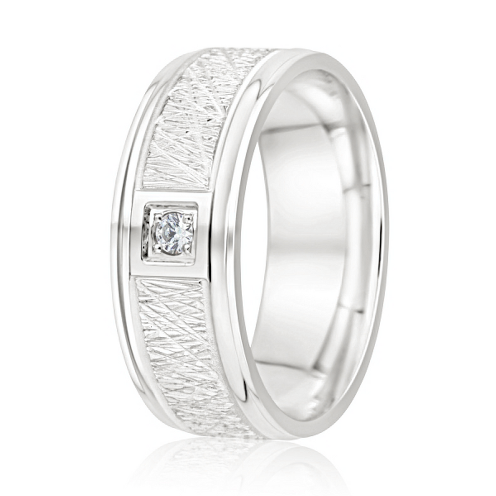 This men’s band features a raised center with a florentine finish, offering a sharp, directional texture that stands out. Grooved high-polish edges add contrast and structure, while a single stone set in a square recess brings a refined focal point. Strong, stylish, and confidently unique—this ring makes its mark without saying a word.