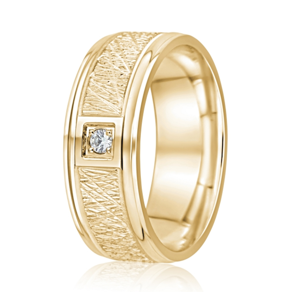 This men’s band features a raised center with a florentine finish, offering a sharp, directional texture that stands out. Grooved high-polish edges add contrast and structure, while a single stone set in a square recess brings a refined focal point. Strong, stylish, and confidently unique—this ring makes its mark without saying a word.
