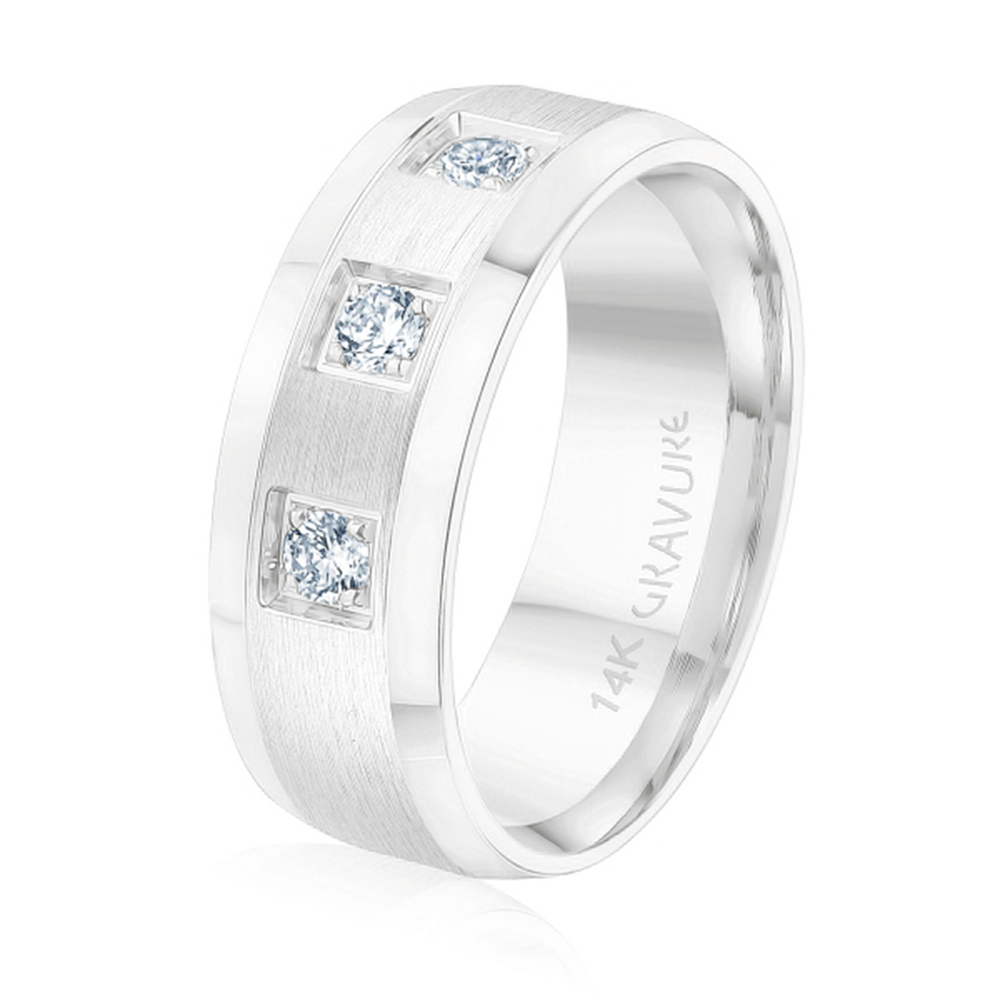 This men’s band features a satin-finish center for a smooth, understated look, accented by high-polish beveled edges that catch the light. Three round stones are prong set in square recesses across the center, adding a refined touch of contrast and shine. Simple, structured, and quietly distinctive—perfect for someone who appreciates classic design with a modern edge.