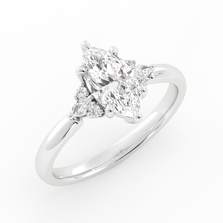 Striking and elegant, this engagement ring features a marquise center stone secured with six claw prongs, set in a graceful basket setting. On each side, three accent stones—two round and one marquise—add balance and brilliance, creating a refined design that blends classic form with modern detail.