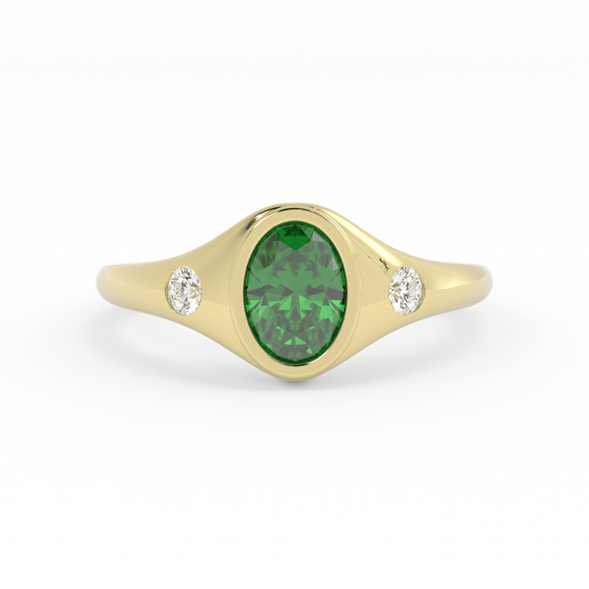 Celebrate timeless elegance with the Cora Three-Stone Signet Oval Emerald and Lab-Grown Diamond Engagement Ring, a striking design from the Olympia Collection. At its heart, a captivating oval-shaped green emerald takes center stage, bezel set to highlight its rich color and timeless allure. Flanking the emerald, two round white lab-grown diamonds are flush set into the sleek signet-style band, creating a harmonious blend of vibrant color and radiant sparkle.