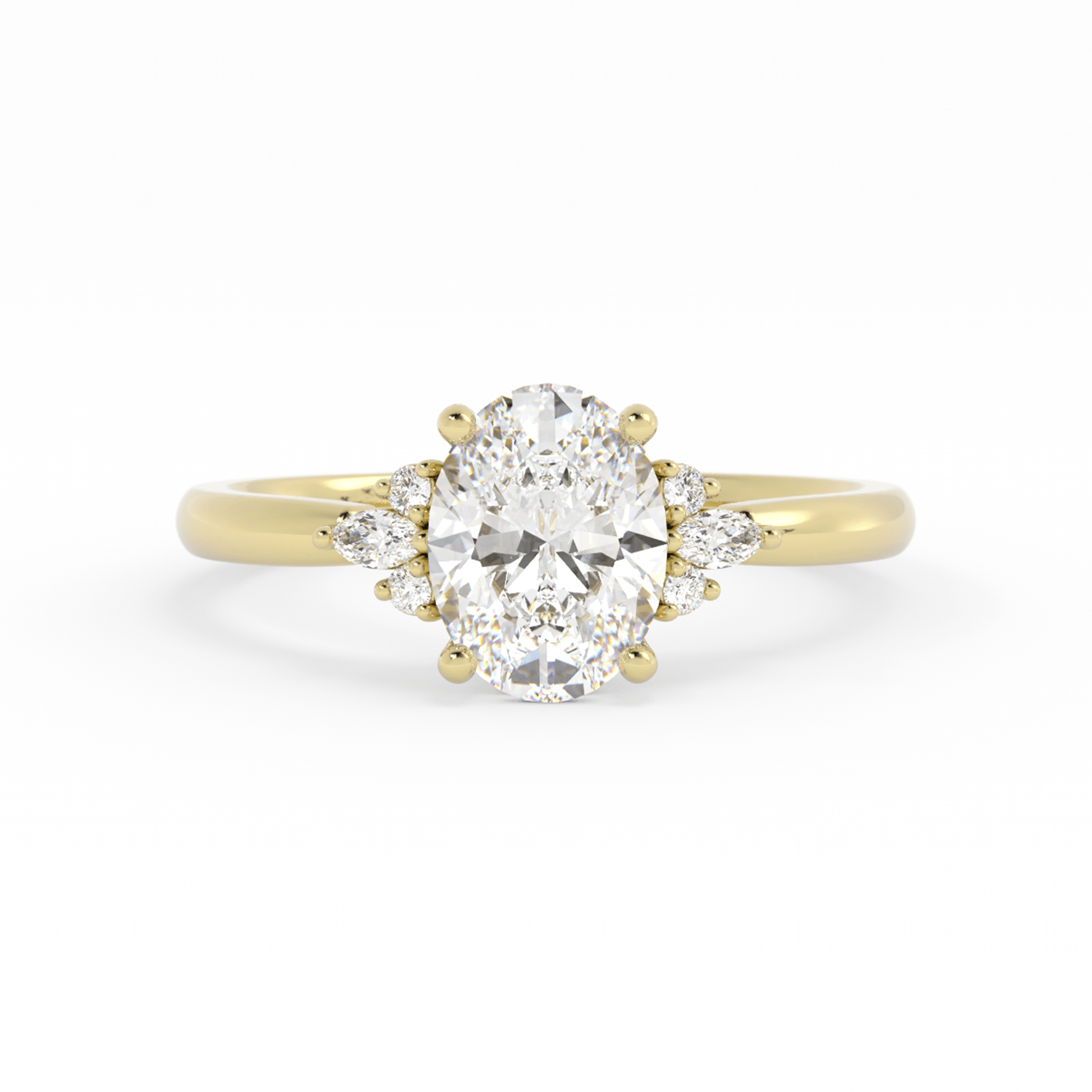 Romantic and refined, this engagement ring features an oval center stone set with four round prongs and nestled in a graceful basket setting. On each side, three accent stones—two round and one marquise—add a balanced touch of sparkle and elegance, creating a timeless design with delicate dimension.