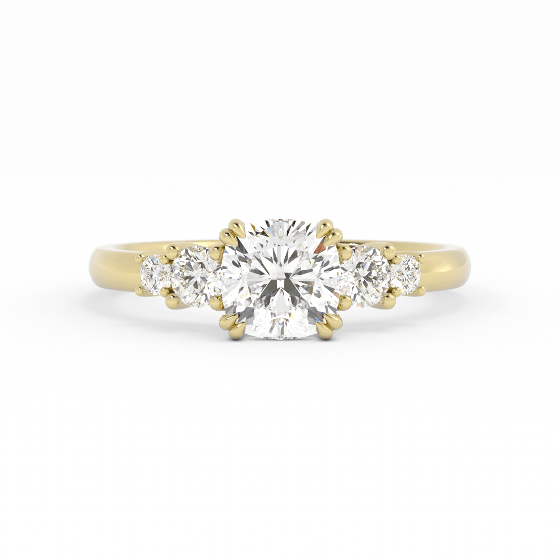 Elegant and timeless, this engagement ring features a cushion-cut center stone secured by four double claw prongs, highlighting its soft, square silhouette. On each side, two graduating round accent stones are set in a graceful basket setting, adding balanced sparkle and a sense of gentle flow. Finished with a refined band, this design offers a classic look with thoughtful detail and enduring beauty.