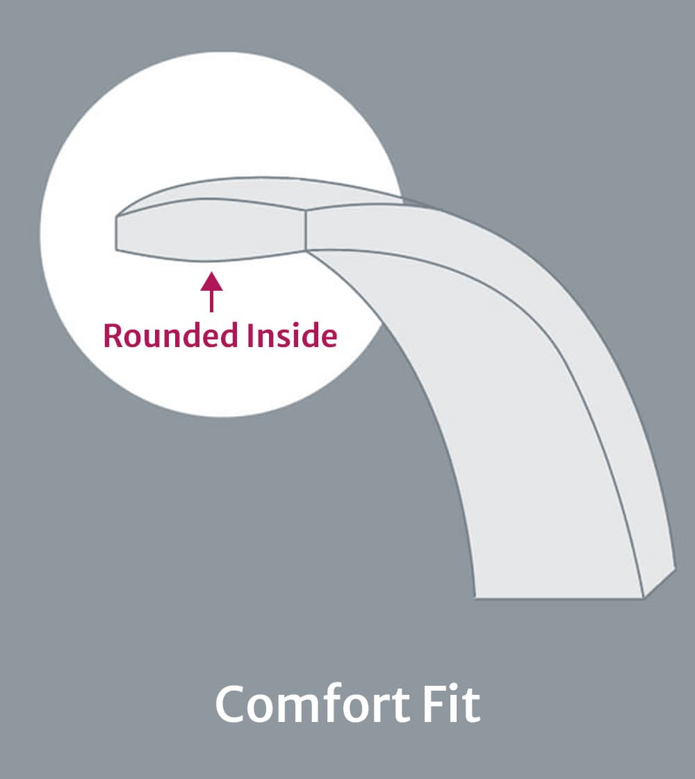 A comfort-fit design is simple and effective. We add a little extra metal to the inside of the ring to give the interior surface a domed shape. The domed shape is similar to the shape of the outside of a domed wedding band.