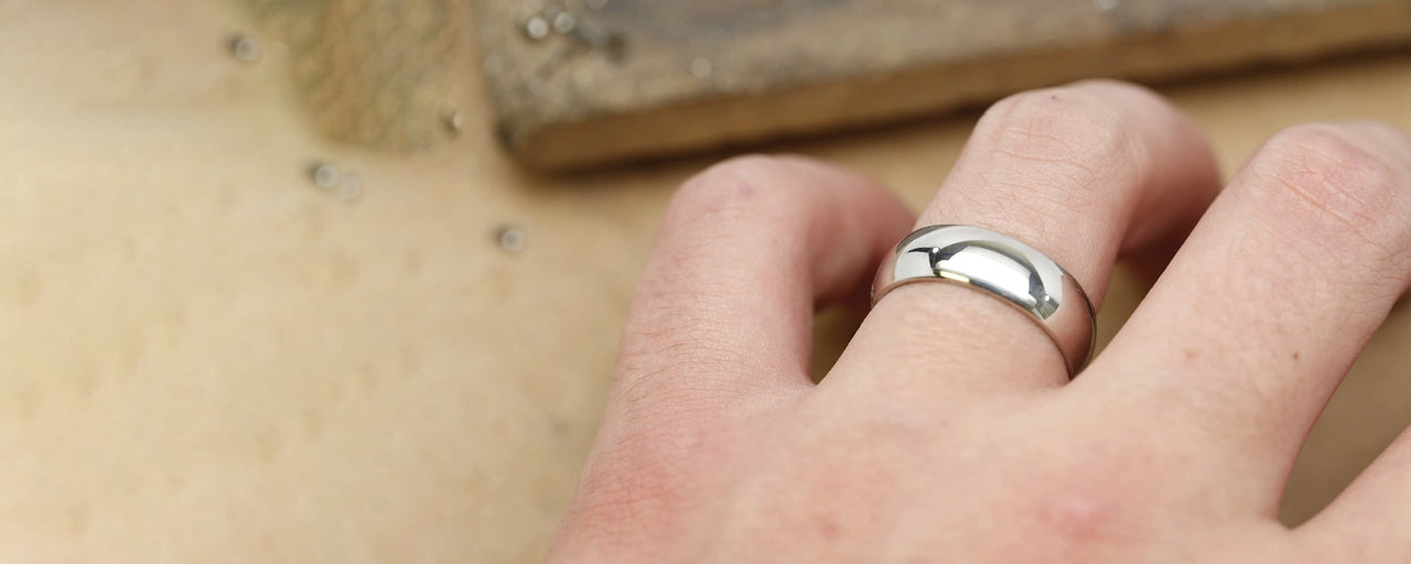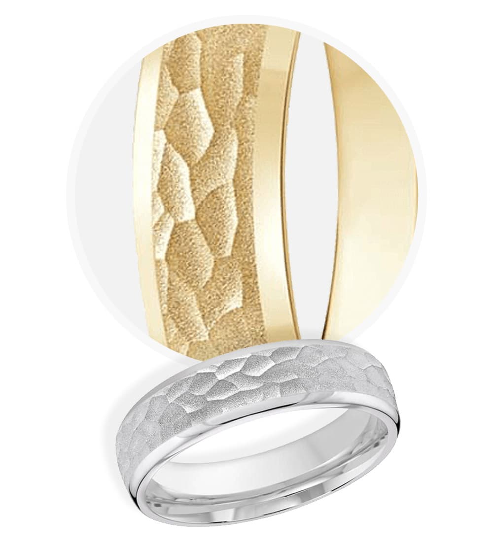 You can have a textured, edgy ring when you choose a band with a hammer finish. This finish has organized dents that look like dings from a hammer. The surface of the ring has dips and ridges that work together to add dimension and style.