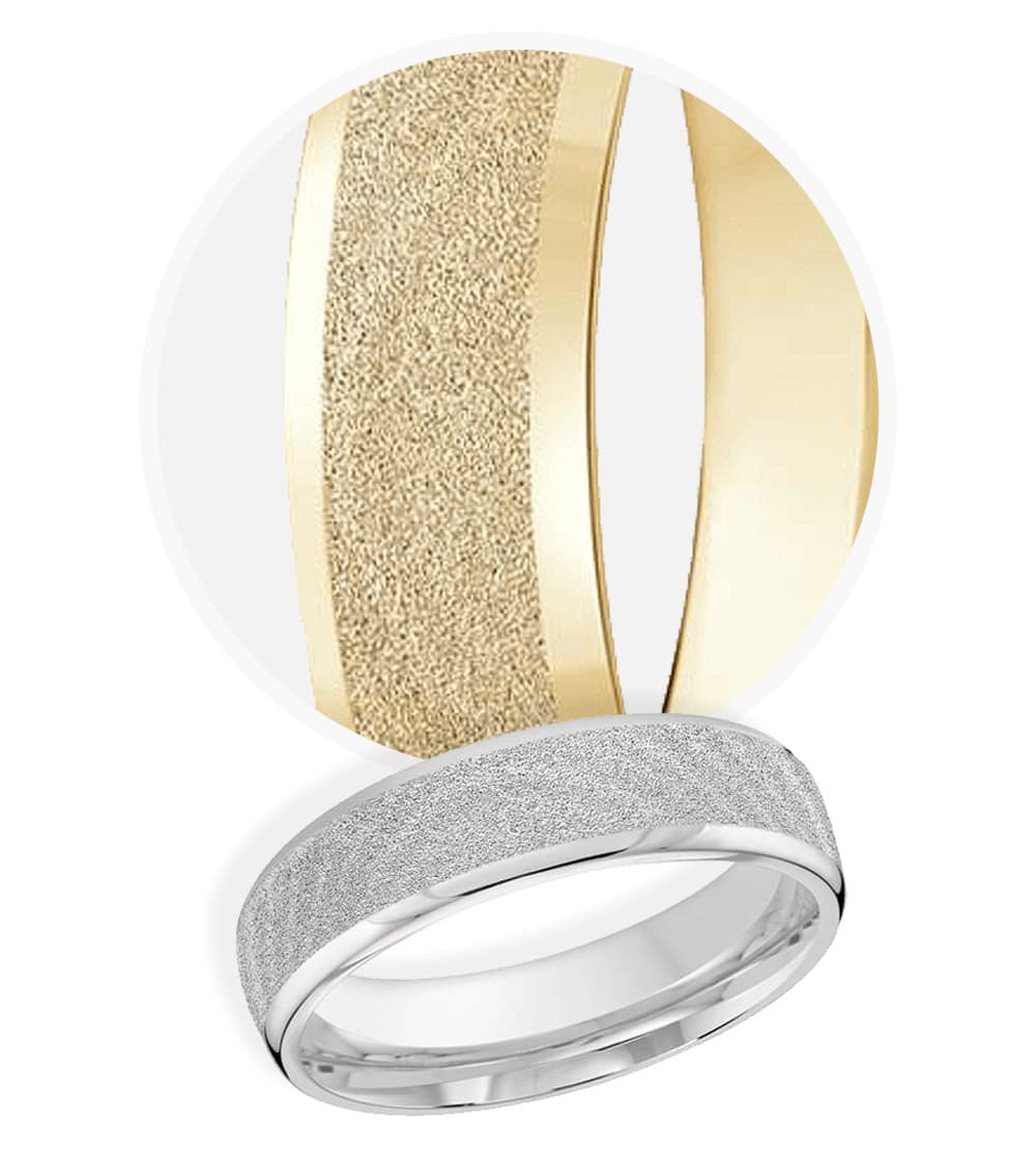 With the rugged sandblast finish you get two textures in one. Not only does the surface have a grainy texture, but the ring will also have a wavy appearance. These two designs combined is what makes this finish one of a kind.
