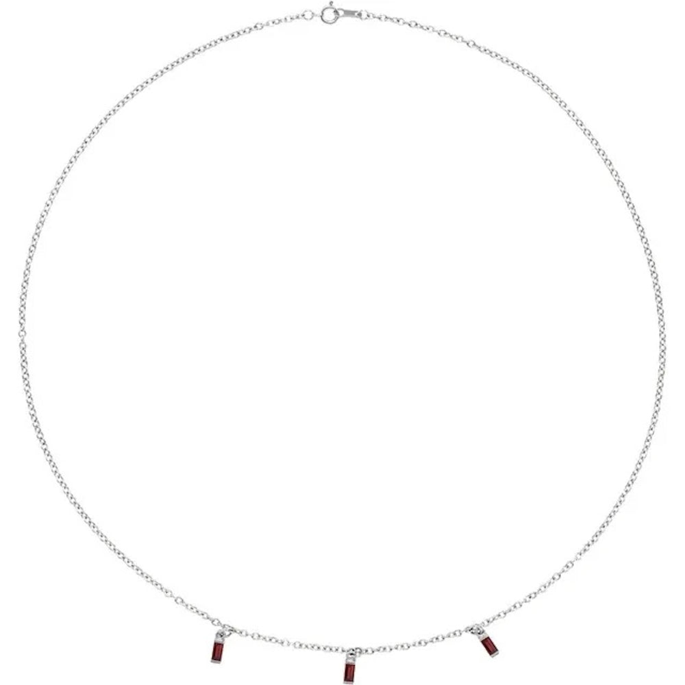 "A timeless piece of understated sophistication, this 16-inch cable chain necklace features three exquisite 4x2mm bar-set Mozambique baguette garnets, each carefully selected for their rich, radiant color. The vibrant, deep red of these AA-quality garnets is artfully spaced evenly around the front of the necklace, creating a striking focal point that catches the light from every angle. The stones are securely set in sleek, modern bars that highlight their angular beauty, offering a contemporary twist on a classic design. Secured with a reliable spring ring clasp, this necklace sits gracefully on the neckline, making it a perfect addition to both everyday elegance and special occasions. Whether worn alone for a minimalist look or layered with other pieces, it promises to be a versatile and cherished accessory for years to come."