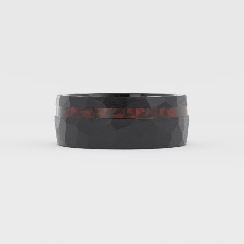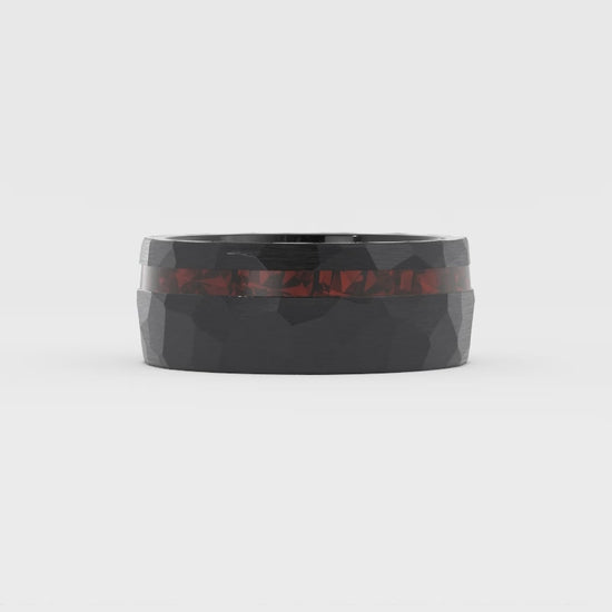 This tungsten ring showcases a bold inlay of crushed fire opal, with brilliant flashes of red and subtle iridescence glowing against the dark backdrop. Its faceted surface adds extra dimension, making the piece striking, modern, and full of character. Read More Read Less