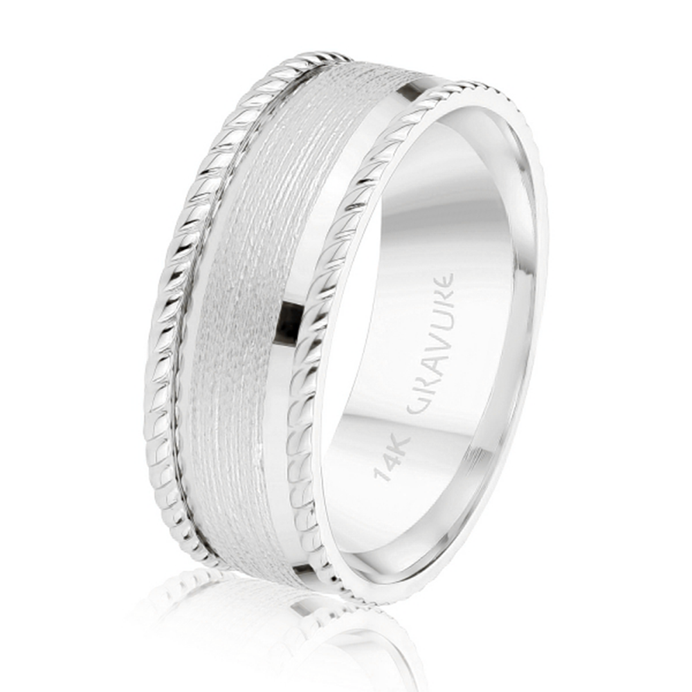 This men’s band pairs a brushed center finish with bold rope detailing along the edges for a look that’s both classic and distinctive. The textured center adds a matte contrast, while the rope borders bring in a touch of rugged style. Strong lines, subtle texture, and durable design—this ring makes a confident statement without saying a word.