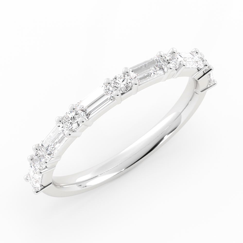 Minimalist in form, this half-eternity band features alternating round and baguette stones set with shared prongs for a seamless, structured look. The clean lines and balanced geometry create a timeless design that’s effortlessly elegant—perfect for stacking or standing alone with quiet confidence.