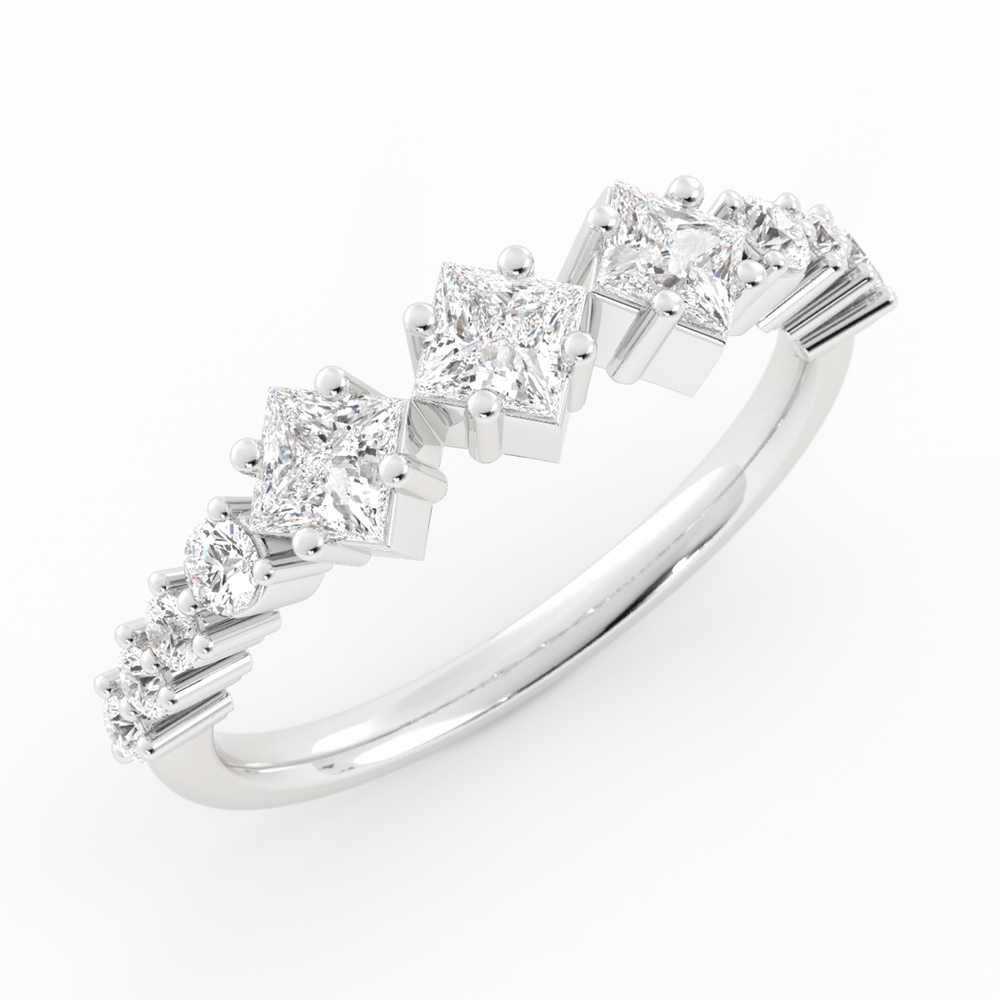 Sharp lines meet delicate shimmer in this elegant three-stone ring. Princess-cut stones are set on point, their angular form creating a striking centerpiece. Along the half-shank, round accent stones add gentle brilliance, blending structure and romance in a beautifully balanced design.